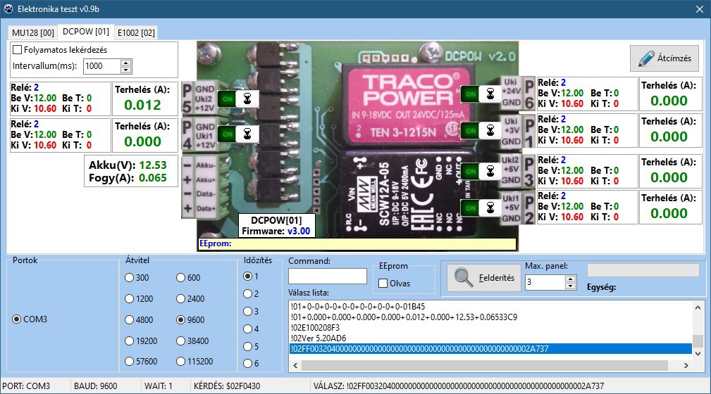 A DCPOW fontos szolgáltatása, hogy a nyákon lévő mikroprocesszor megméri a bemeneti feszültséget (0-18V méréshatárral) és ezt az RS485-ön le lehet kérdezni. A kimeneti portokon az áramfogyasztás is megmérésre kerül (0-10A méréshatárral), ezt szintén le lehet kérdezni, praktikusan egy parancsba foglalva a feszültség és áram adatokat. Ezáltal a fogyasztási folyamatok finoman monitorozhatók, ami az energia stratégia továbbfejlesztését teszi lehetővé.